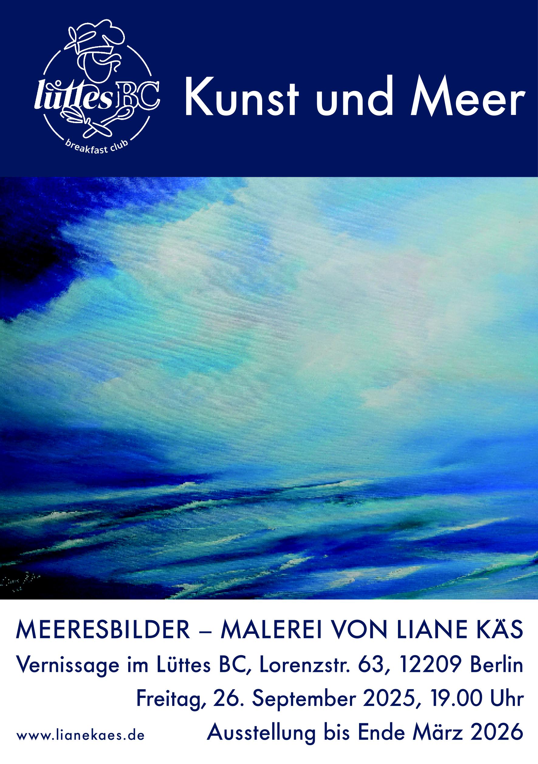 Die Ausstellung „Kunst und Meer“ mit neuen Bildern von Liane Käs startet in der Galerie im „Lüttes BC“, Lorenzstraße 63, 12209 Berlin. Vernissage am Freitag, 26.09.2025 ab 19:00 Uhr mit Überraschungen. Weitere Veranstaltungen bis März 2026 siehe Flyer Rückseite.